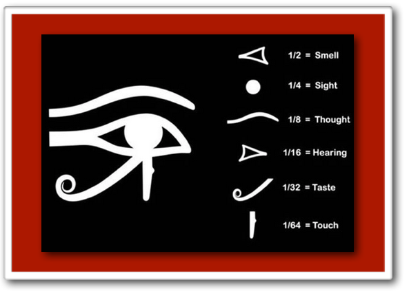 The eye gives access to space/volume, and therefore a means by which to measure. In Egypt, the sections of the eye were the glyphs for the fractions 1/2 to 1164. The parts total 63164. [The sum of successive division will always fall short of true unity except at infinity, which is perfectly consonant with Egyptian conscious understanding that only the Absolute is “1” (on the objective plain of reality and “0” within the spiritual.]