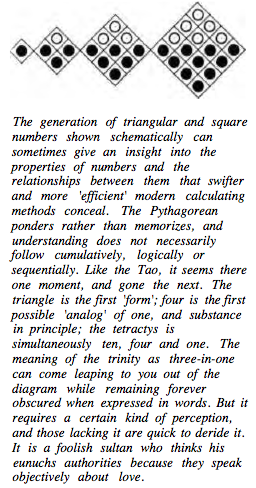In ones study of The SEPHER YETZIRAH/The Book of Formation it becomes clear that it is not simply of value what is written there, but even more so how the spell(s) are articulated. An example of which is found in the cipher of the 13th Sephira which shows how the text is constructed, in which the text as a key in fact shows the body of the treatise in a very unique and particular formation, one in which the Teacher begins to formally admonished the student on the importance of the node or number “10” in the 4th Paragraph of Chapter1. And is expressed in manner to illustrate that the expression of all material consciousness is calibrated through the number 10. Thus Chapter “1” Paragraph “4” represents the sum total of the whole numbers 1 thru 4 or 1 + 2+ 3 + 4 = 10. So as not to lose anyone, I’ll use lay out certain aspects reflective properties regarding numbers which may aid in bridging the gap between how numbers are viewed and what they really are.