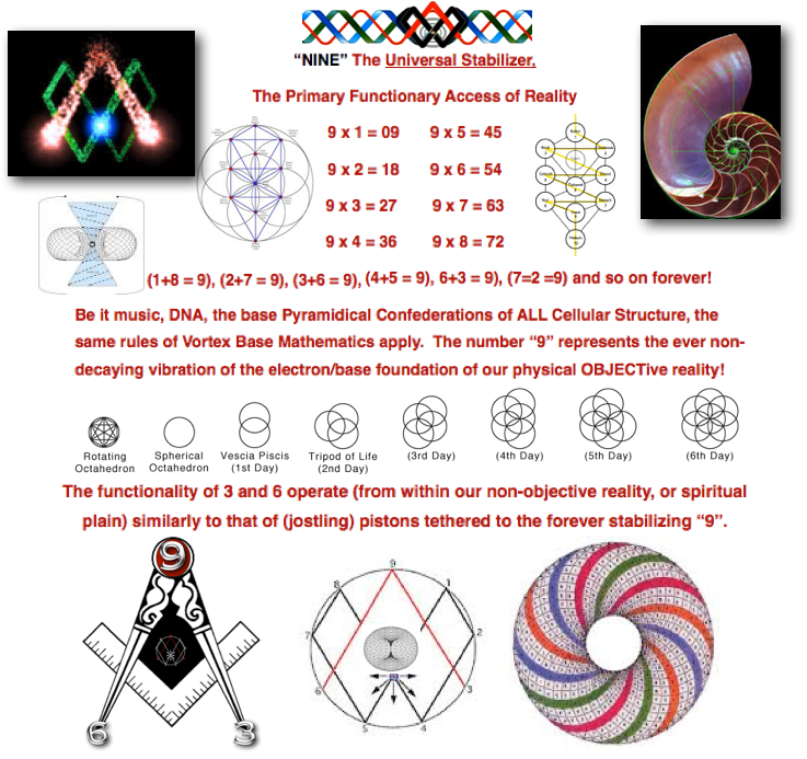An additional good place to begin is explained within Roden’s Video on Vortex Based Mathematics. Viewing the video to which the aforementioned hyperlink is connected will provide you a solid foundation in your ability to comprehend how the Nodes (numbers) 1,2,4,5,7, and 8 operate within our OBJECTIVE realm (powered by the SUBJECTIVE real’s oscillation of 6 and 3 anchored by 9 with “0” serving as our Cosmic TORRENT’s Vortex.) Although known for eons, this and much more has been purposefully hidden from the masses while used by others in nefarious metaphysical fashions to manipulate the course of humanity.