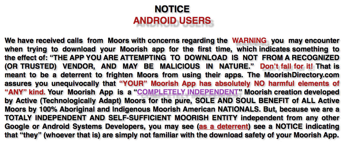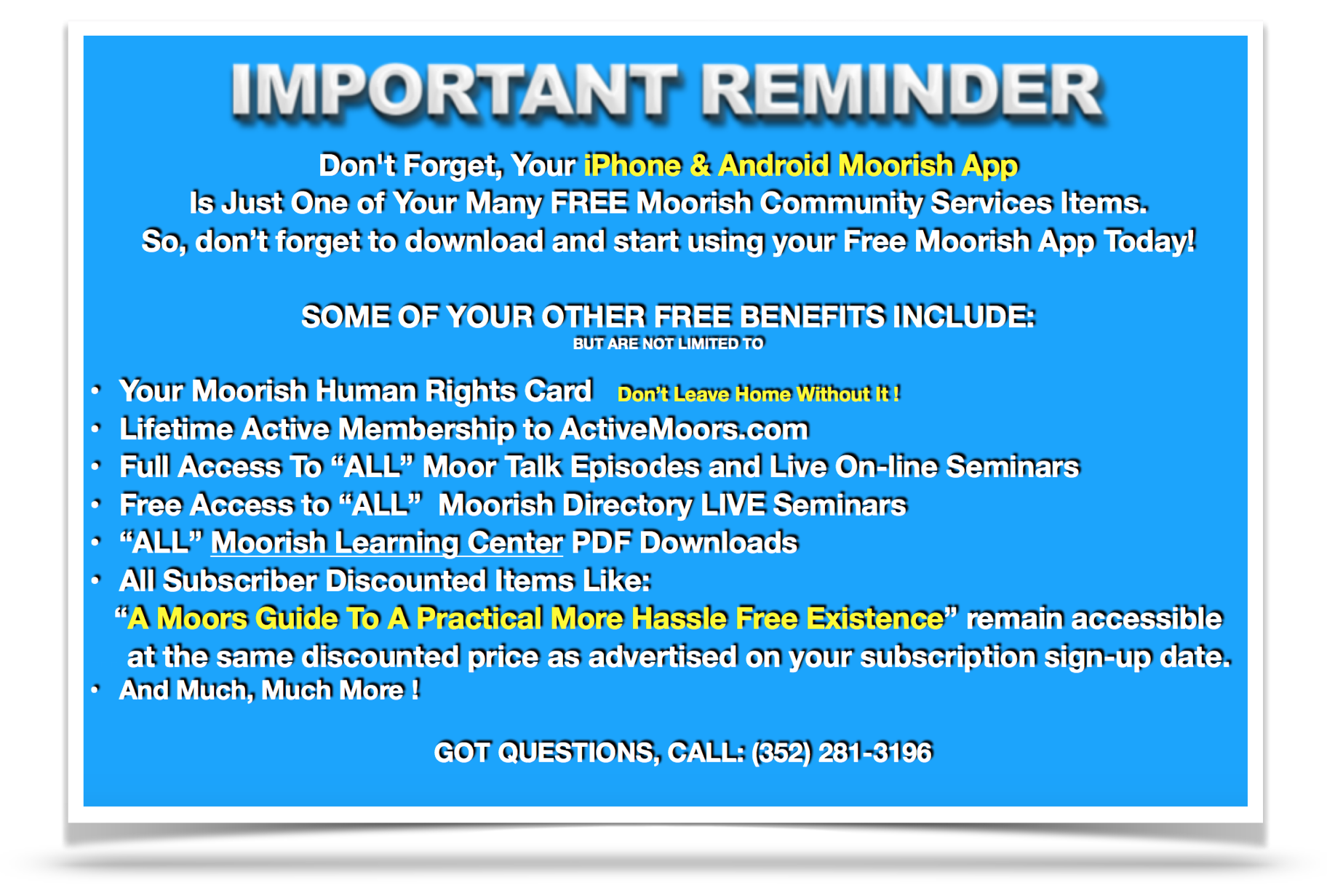 Local Area Moos in your Community, Region, Townships and Counties are waiting for you to hook-up, join-in and Start Building at ActiveMoors.com today! At ActiveMoors.com you can create and build your own Pages, Community Forums, Meeting Rooms, Educational Round Circles Discussion Groups and/or any other form of Networking Organization you wish, both PUBLIC or PRIVATE! It’s up to you! And your imagination is your only limitation! And, although ActiveMoors.com is a Moorish Community Based Resource, the Groups, Forums, Meeting Halls and Community Circles you create (both Public and/or Private) are in no manner limited solely to Moorish Affairs. You’ll find New Groups of all kinds sprouting-up every day at ActiveMoors.com. From Music to Art, Cooking, Finance, Job, Buisness and/or Career Building Cooperatives and Collectives of all and every kind are always welcome and growing each day at ActiveMoor.com. Why would any Active Moor simply limit themselves to another community’s technological recourses like Facebook when you have your own Moorish Social, Civic and Creative on-line resources dedicated to serving the betterment your own Moorish Community! And speaking of Facebook, did you know Moorbook is (due to your helpful Membership donation) now also becoming a reality (now under construction.) Another great example of how your active participation and Nation Building activities are expanding the ever growing resources of your Moorish American Community is: “THE MOOR APP!” Free For All downloadable from Apple’s App Store as well as Google Play! And that’s just the tip of the iceberg!