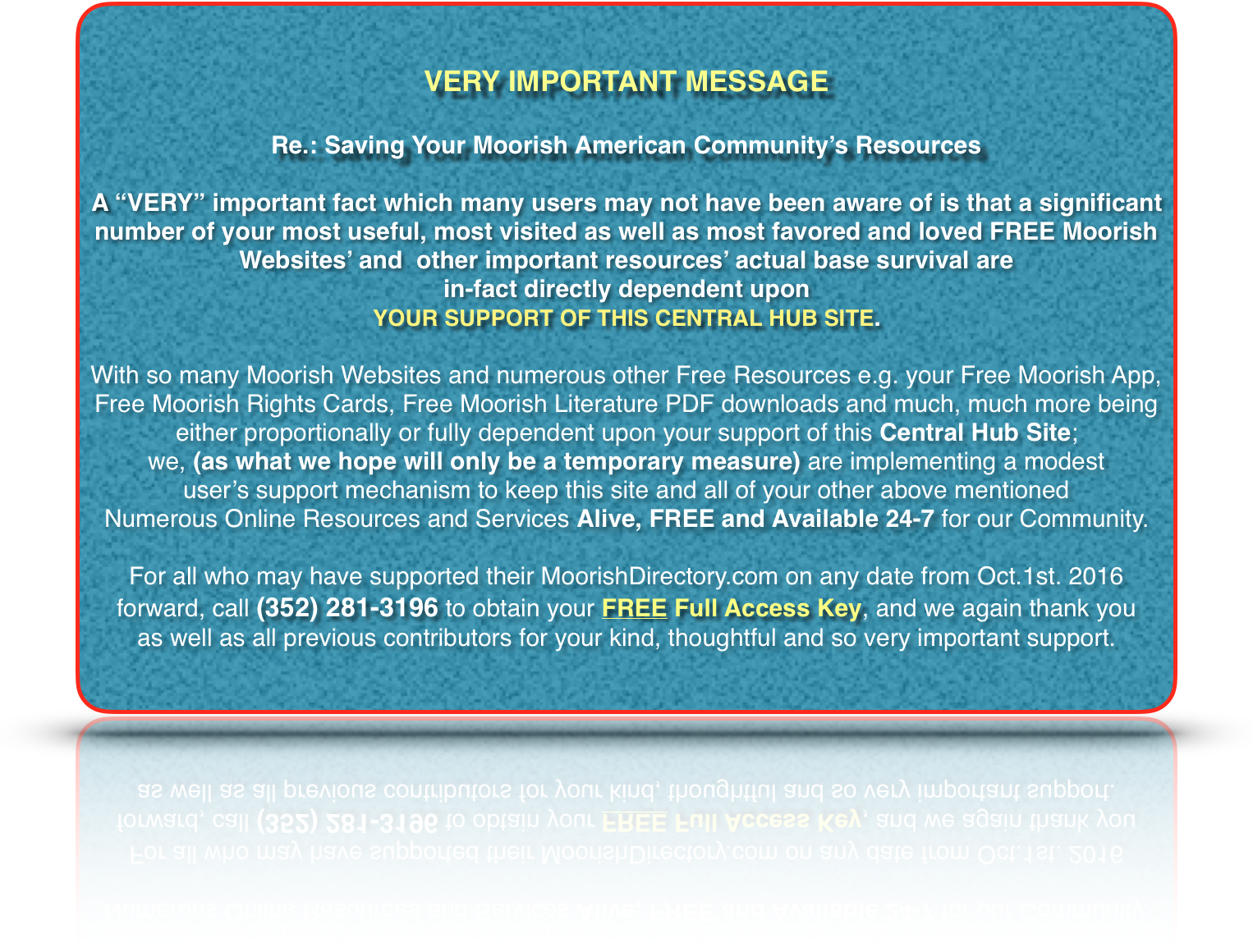 So, as you can see, we here at “YOUR” MoorishDirectory.com are doing our absolute best to efficiently and effectively stretch each and every cent of your kind and thoughtful Membership Donation while we remain