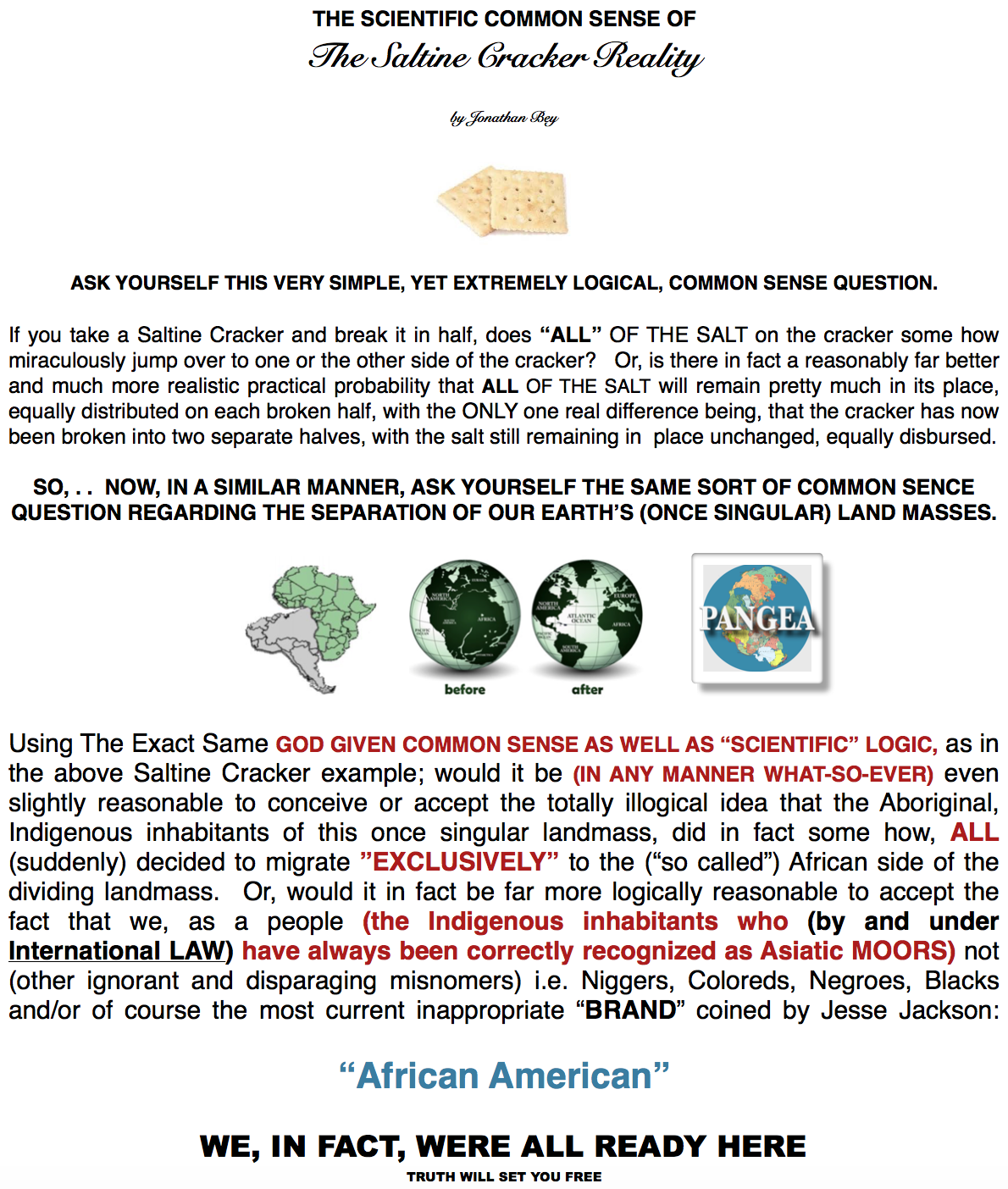 If you would like to make even a greater impact (in assisting other to awaken) scroll down to “The Saltine Cracker Example” and print that out as well to be distributed along with “The Great American Riddle”. Combining these two “COMMON SENSE” documents as a singular Active Moors’ Community Hand-out is a Powerful way of assisting others in making that Critical Mental Paradigm Shift required to begin the awakening process in those who may still be having difficulties accepting the realities that have been keeping them in Mental Bondage. GIVE IT A TRY! You’ll see. This combination of “Common Sense “SCIENTIFIC FACT”, Simple Logic Based Practical RATIONALITY Stimulates Sound Reasoning!