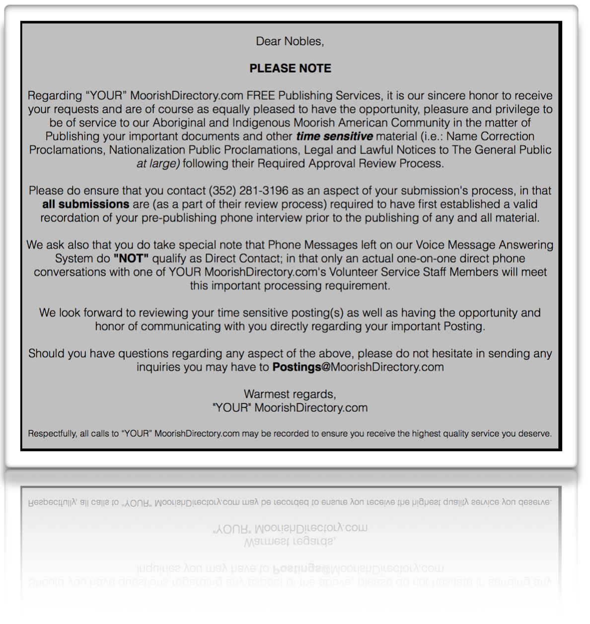 As of Wednesday, April 15, 2015 “YOUR” Moorish Directory is now prepared and making itself available to accommodate your Proclamation Publishing requirements. All and any individuals wishing to have their Proclamations PUBLISHED should contact (352) 281-3196 and your documents will be published alongside the following Honorable Faithful Moors: