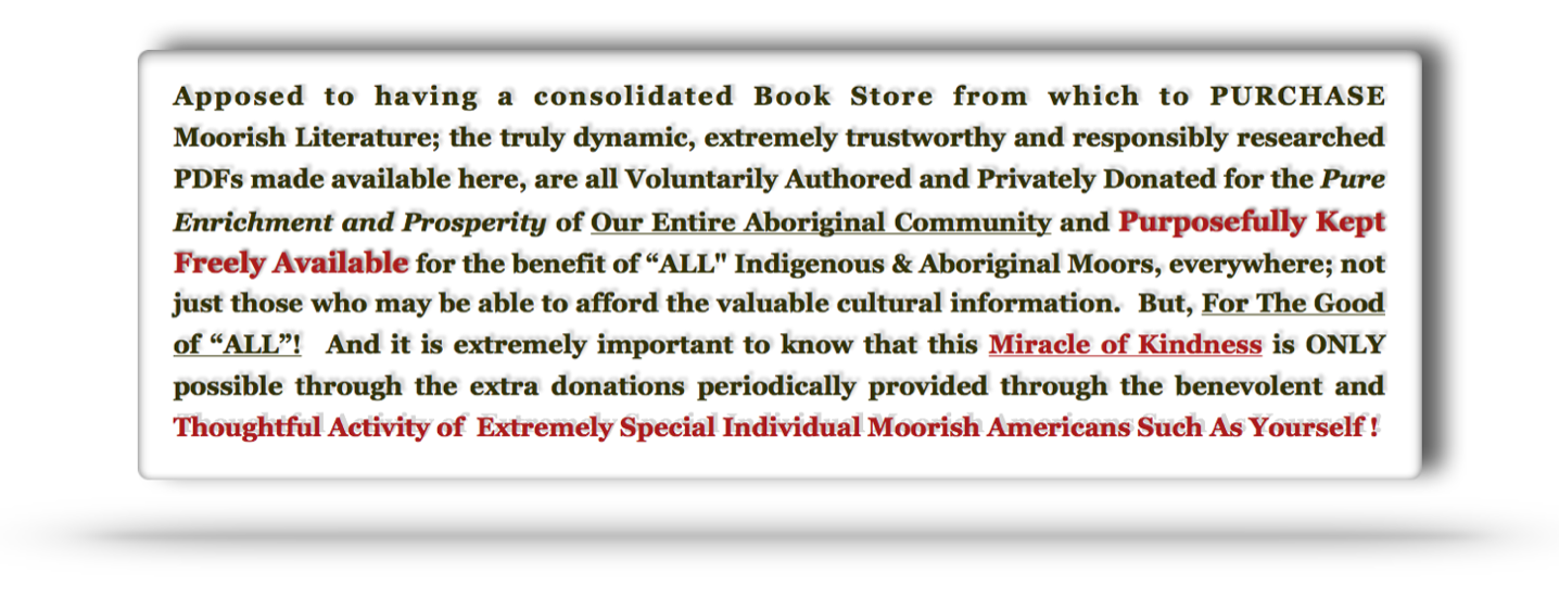 IN SHORT, . . although Very Greatly Appreciated, . . The subscription donations received from our Full Access Membership (to all of the resources within “YOUR” MoorishDirectory.com) come far, far short of being able to keep in existence all of the above named active resources, as well as all of the other many sites, growing technological devices and expanding resources which your private (non-subscription) gifts of support keep alive as our community’s resources. “ALL” proceeds from the very few numbers of “For Purchase” Educational Items which one may happen to see on this site, ALL, also do go DIRECTLY to keeping our Moorish Community Resources on-line and available for those who would otherwise have no other means by which to benefit from the donated material and Services; because none of this would exist without you! So, in advance, we sincerely thank you for all and any added gifts of support you are able to give. You and your Extra Support ACTIVITIES are very much appreciated!